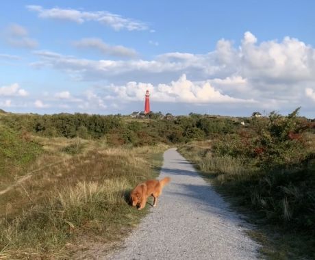 Oh, wat konden we daar samen van genieten.… Mijn liefste hondenvriendje Juup en ik, vroeg in de ochtend in alle rust en stilte een rondje door de duinen. Achter ons favoriete vakantiestekje It Aude Kolonyhus de duinen in, tussen de Zuider- en de Noordertoren. En op de stukjes waar het mag even lekker van de riem los…. Samen de zon zien opkomen, de konijntjes zien huppelen, genieten van de altijd durende rust op ons favoriete eiland. En dan een klein heuveltje op en daar is hij, de prachtige rode Noordertoren. We lopen verder en voelen allebei de aantrekkingskracht van het strand en de zee, voor een frisse ochtendduik. Ook samen….